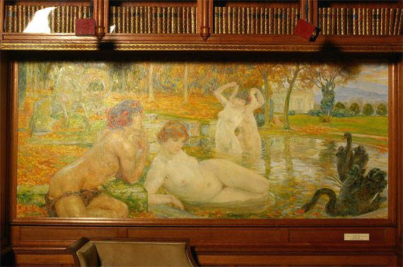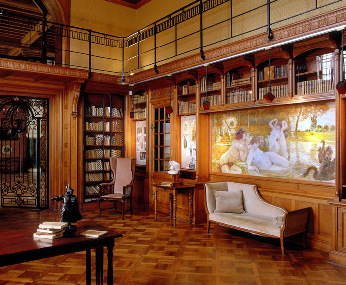 ![]() Histoire de la Villa Arnaga - Visite du rez-de-chaussée - Visite du premier étage - Les Jardins La Bibliothèque Consacrée aujourd’hui à l’évocation des acteurs de Cyrano, la bibliothèque d’Edmond Rostand contenait plus de 15.000 volumes. Deux toiles d’Hélène Dufau représentant des Baigneuses et L’Automne complètent l’allégorie de la nature, sculptée en bas-relief au linteau de la cheminée par Verlet. Histoire de la Villa Arnaga - Visite du rez-de-chaussée - Visite du premier étage - Les Jardins |